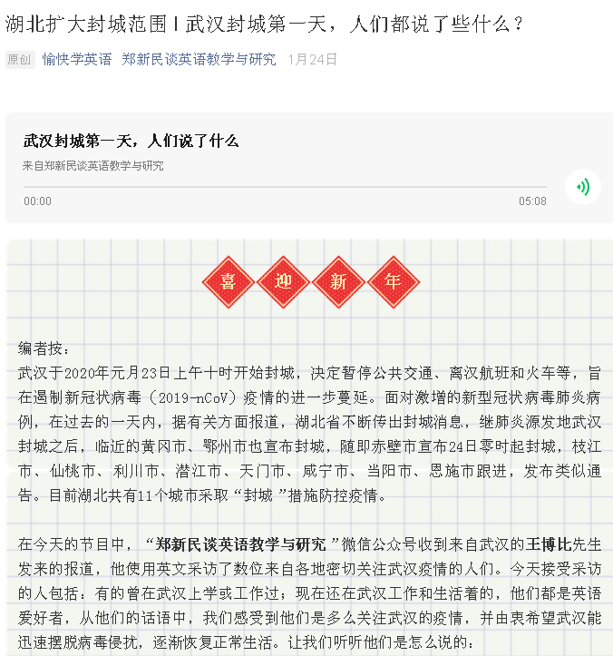 1月23日,腊月廿九,武汉下达封城令,暂停所有市内交通工具,关闭所有离汉通道。听到这一消息,王老师说他哭了,他最担心的事情还是发生了。擦干眼泪,他做了第一件志愿工作:用英语采访遍布全球的十多个地大“外语人”,请他们谈谈此时此刻的感受和心愿。该英语采访文稿和录音,次日(除夕)发表于上外“郑新民谈英语教学与研究”公众号(//dwz.cn/VCTtLYnz),
