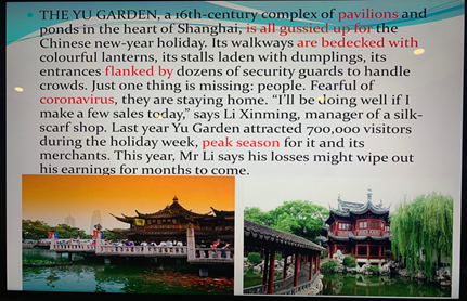 这个星期的综合英语课,我抛开了课本,另外选择了一篇《经济学人》中的文章---Coronavirus economics(病毒经济学)。之所以选择这篇文章,不仅仅因为它的内容非常贴合我们当下的经历,更重要的是我想通过这篇文章告诉学生们:疫情虽然对中国的经济产生了极大的负面影响,但是我们依然要坚定信念,期待未来;疫情并不可怕,可怕的是我们看不到这场战斗中凝聚的希望和力量。讲完文章,依然意犹未尽,随即从网上找到了几张西南联大的照片,并告诉学生们,西南联大是世界教育史上极为光彩的一笔,面对日寇的侵袭,短缺的物资,艰苦的环境,前辈们依然孜孜不倦,潜心向学,成就了大批的学术泰斗和两位诺贝尔奖获得者,这种精神在目前的形势下更值得我们学习和思考。清华大学前校长梅贻琦在回答学生“什么是真实”的问题时说到:“你看到什么,听到什么,做什么,和谁在一起,有一种从心灵深处满溢出来的不懊悔、也不羞耻的平和与喜悦,这就是真实。”我把这段话写在了我的PPT最后一页,我想告诉学生们,虽然远离尘嚣,但老师希望他们依然能够内心笃定,从容平和,不忘初心,砥砺前行。只有真实地感受到内在的平静,才能更好地思考自己的当下和未来,思考应该怎样度过这一生。等到春暖花开,回归校园的时候我们再回首这个令人难忘的寒假,不会因为虚度年华而悔恨,不会因为碌碌无为而羞耻。
