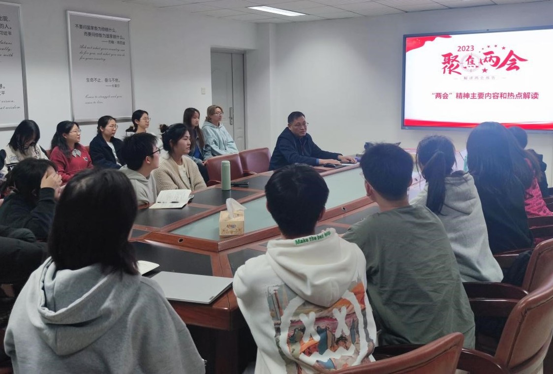 本科生英语+工商管理班党支部开展主题党日活动,全体党员和入党积极分子参加会议,院党委书记刘世勇领学全国两会精神。