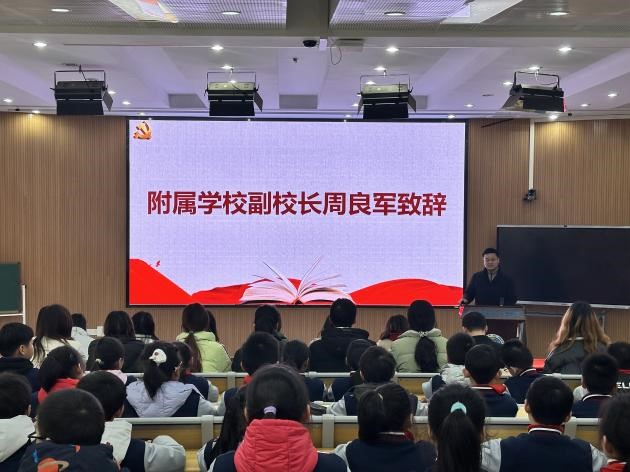 会议伊始,附属学校副校长周良军发表了热情洋溢的致辞,他代表学校感谢大学生志愿者们的辛勤付出和奉献,并围绕“三学三做”勉励附校同学学习志愿者的优秀品质和学习方法,积极付出行动,全面发展,他希望支教同学们能够珍惜这难得的机会,相互学习、共同成长。