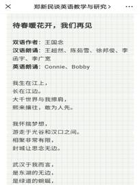 疫情期间,老师们用声音传递坚定的信念,用文字表达虔诚的祝愿。为国际友人提供力所能及的帮助,主动联系滞留在国内的留学生和国际友人,给予他们积极正面的鼓励:不要害怕,要相信中国政府,相信自己的学校,和中国人民一起一定能取得病毒阻击战的胜利。徐邦俊老师在同事发表的有关疫情的2篇公众号推文中,参与其中诗歌朗读,为抗疫加油。徐冰洁老师向俄罗斯老师介绍了中国的在线教育情况并推荐了实用的教学软件。任晴老师为西班牙友人翻译公益告示一篇(内容为提倡大家为了自己和他人的健康勤洗手,以及正确洗手的方法)。龙绚丽老师为日企员工讲解健康防疫方法……