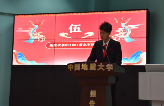 本科新生曹志宇发言。他鼓励同学们积极转变身份、适应大学生活、树立生涯目标,将个人命运与专业、社会和国家的发展相结合,敢于勇攀高峰,早日实现自己的人生理想。