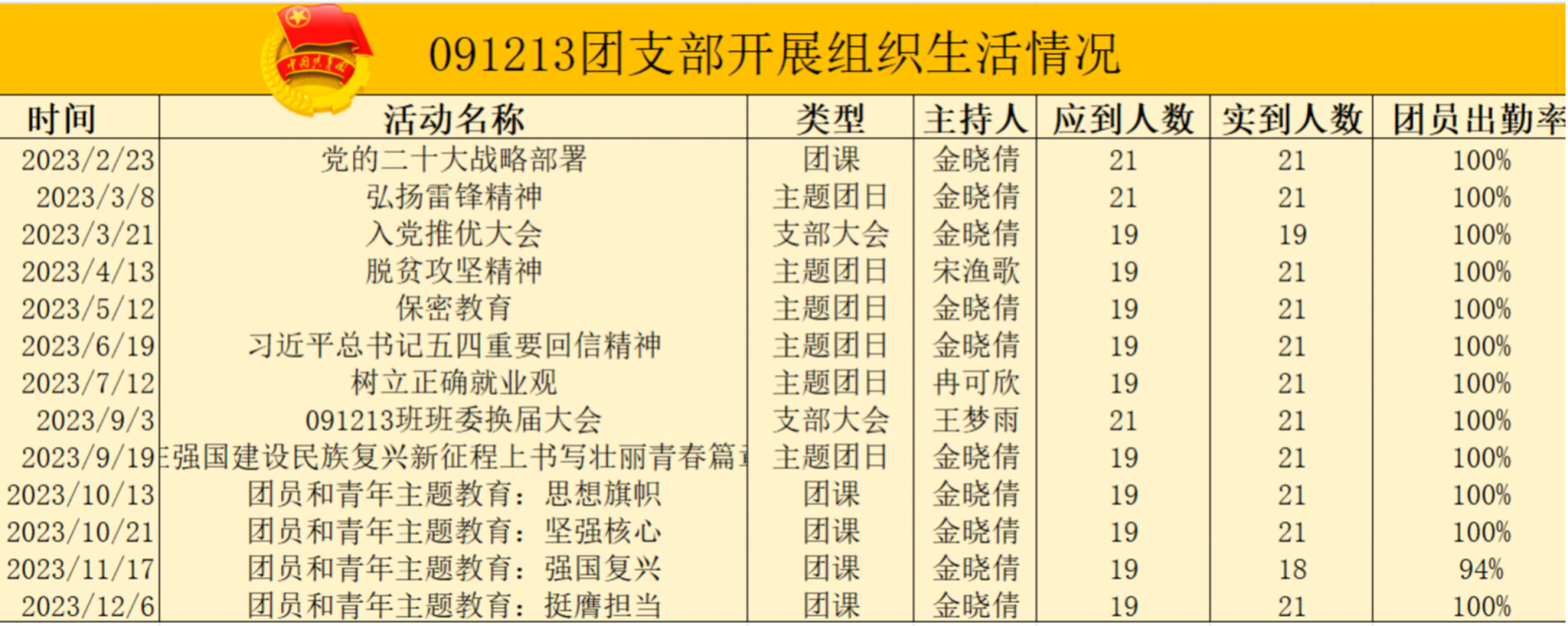 091213 团支部是一个团结友爱、有大局意识、有争先精神、不断进取、敢于超越的团支部。班委会和团支委各司其职,相辅相成、密不可分,开展了一系列富有特色的班级活动,支部建设取得了初步成效。日进一卒,功不唐捐。班级全体同学将不断强化专业学习、丰富实践活动,在成长的道路上知行合一、脚踏实地、争做大有可为、大有作为的青年。