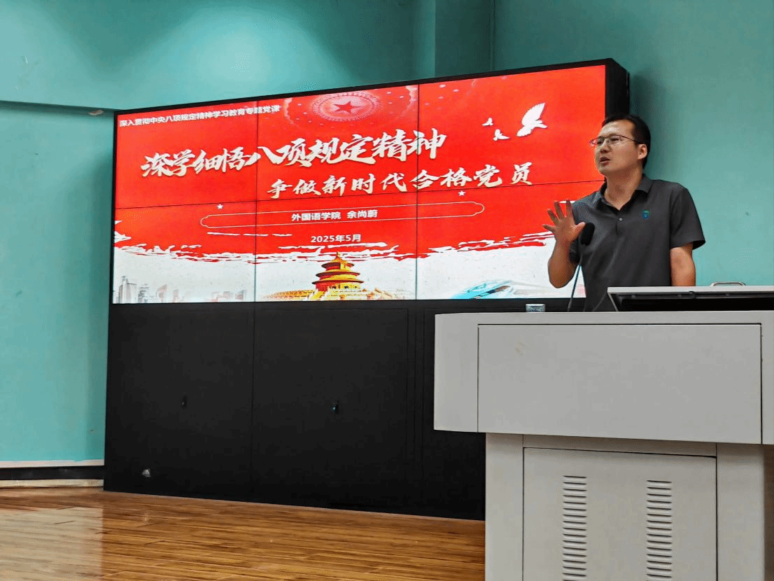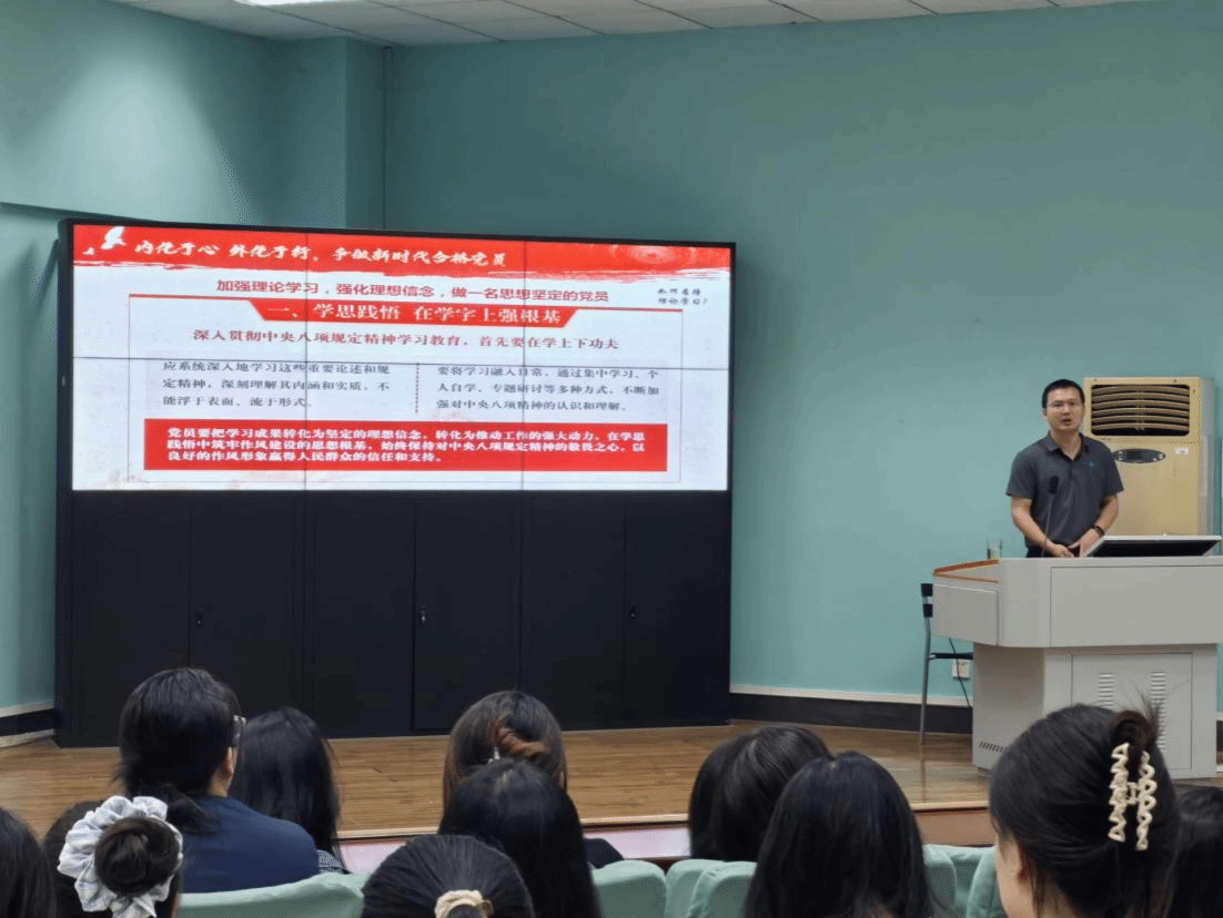 党委副书记余尚蔚以“深学细悟八项规定精神,争做新时代合格党员”为题给全体学生党员讲授专题党课。