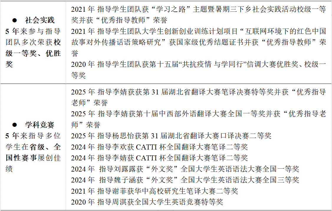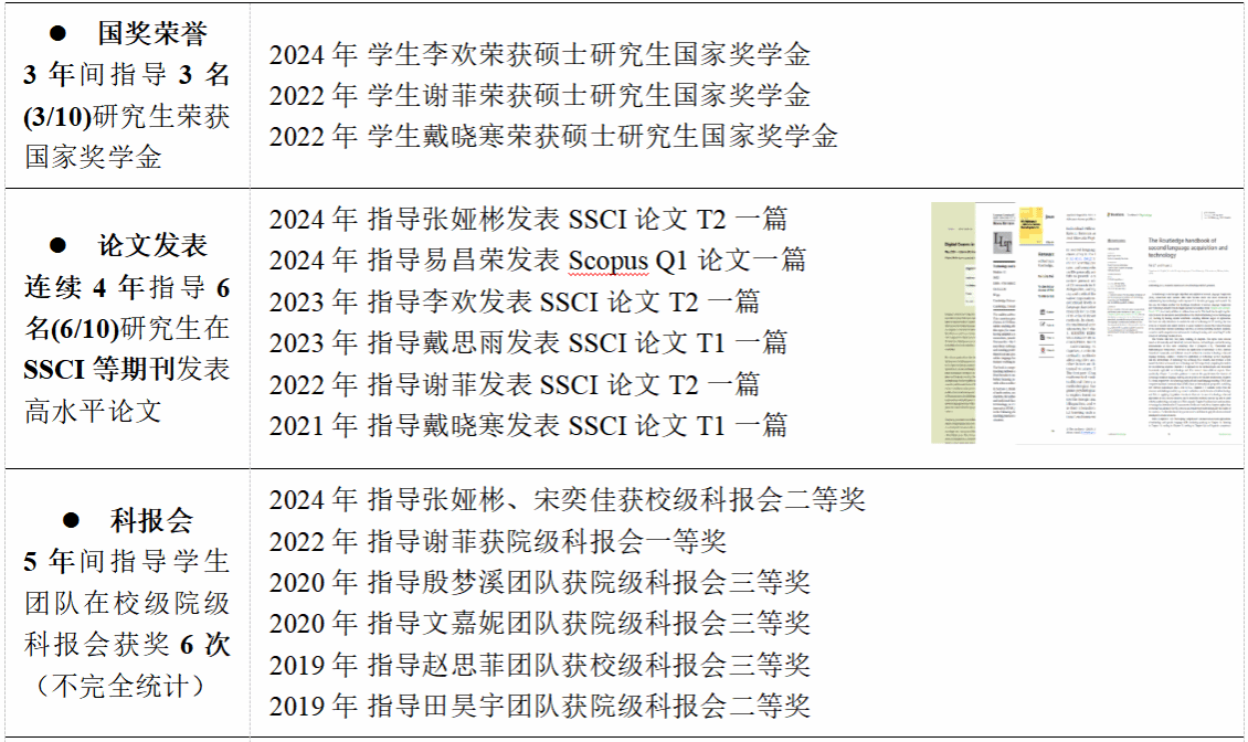 李菲副教授的高尚师德也得到了社会与学术界的广泛认可。她参与的教学团队曾荣获多个教学荣誉和奖项,如2021年荣获“国家级大创项目优秀指导教师”、“暑期社会实践优秀指导教师”和首届教师教学创新大赛湖北省三等奖、2020年荣获外研社“教学之星”大赛英语专业组全国复赛一等奖等荣誉,这些都体现了她对学生全方位成长的支持与帮助。校外,她在知名科研培训中心(山东省国高教育研究有限公司)担任资深学术导师,系统性地开展研究方法专题线上课程教学工作,为来自全国多所高校的研究生及青年教师提供专业指导,显著提升学术素养和科研创新能力,助力学术职业发展。