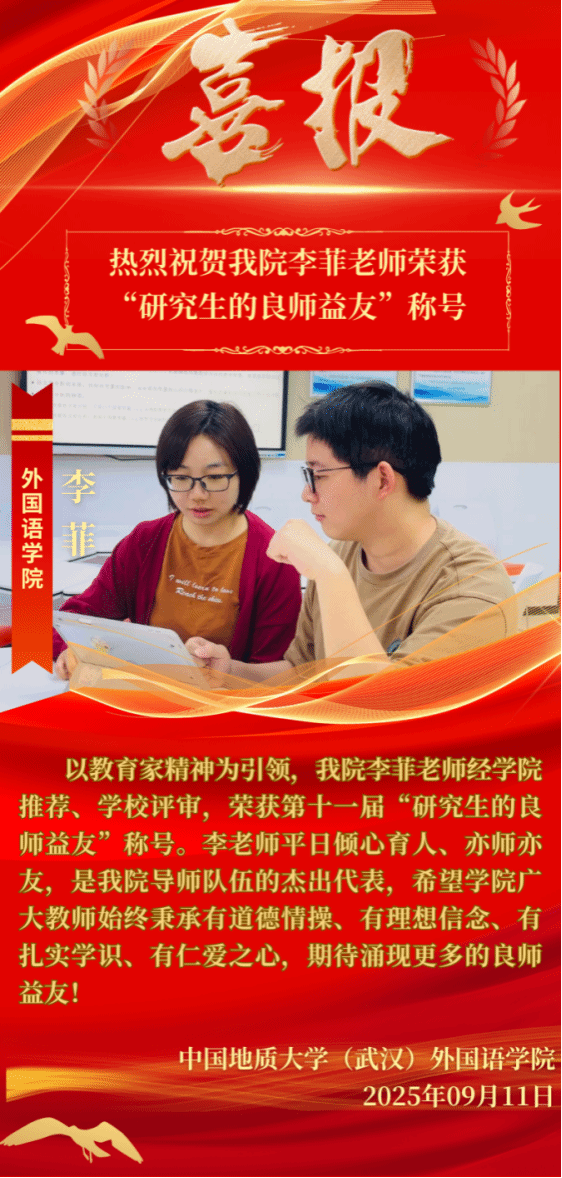 李菲老师累计指导硕士研究生10名(学硕4人,翻硕6人),其中已毕业2人,分别就职于广州应用科技学院、深圳外国语学校宝安学校。她不仅注重学生在课堂上的表现,还非常关注他们在学术研究和科研能力上的培养,指导的学生曾多次在国内外学术竞赛和论文发表中取得突出成绩。在课外活动和科研项目方面,李菲副教授学生团队参与了多个国家级和省级项目,体现了李菲副教授在推动学生学术创新和实践方面的成就。她还积极支持学生参与各类社会实践活动,这些活动不仅帮助学生提升了社会实践能力,也加强了学生的社会责任感。以下为李菲副教授指导的部分学生荣誉展示: