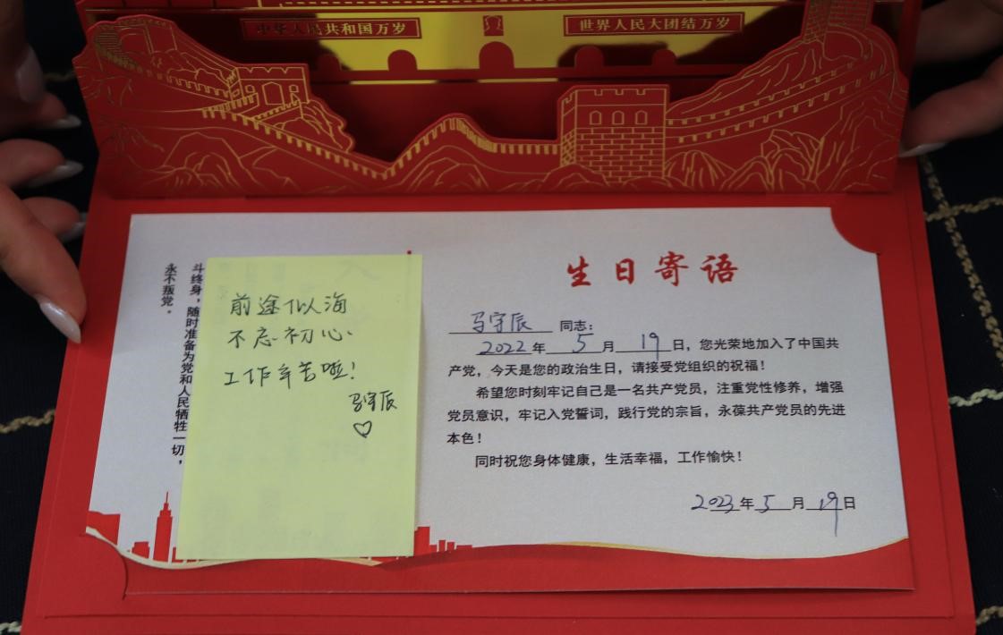 最后,支部共同为李可等十名党员同志庆祝了“政治生日”,用庄重的政治仪式,激励党员同志不断强化身份意识,宗旨意识和责任意识,进一步增强党组织的战斗力、凝聚力。支部书记倪一笑为十位同志分别送上了政治生日贺卡和寄语,希望各位同志时刻牢记党员身份,把服务人民当成责任、把刻苦学习当成乐趣,强化政治历练,淬炼党性修养,切实做到不忘初心,牢记使命。
